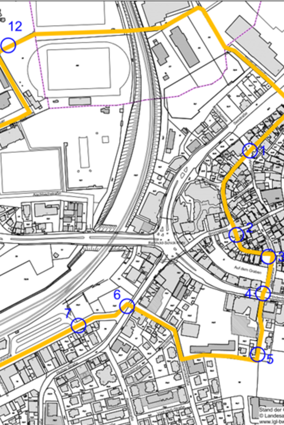 Die Darstellung zeigt den Verlauf eines Ortstermins mit der Stadtverwaltung am 8.November 2022 mit 16 markierten Diskussionspunkten.
