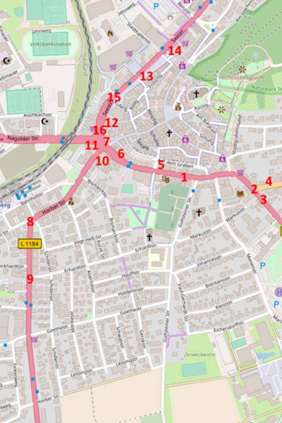Für eine gefahrlose Verbindung der Hildrizhausener Straße mit der Innenstadt wurde von der Stadt über Jahrzehnte der Gehweg neben der B296 für Fahrräder frei gegeben. Inzwischen wurde dieses 'Fahrräder frei' Zusatzzeichen für den Gehweg alternativlos gestrichen. Radfahrende müssen nun auf dem Weg in die Innenstadt auf einem der gefährlichsten Abschnitte der Bundesstraße fahren und zurück zweimal innerhalb weniger Meter diese vielbefahrende Straße kreuzen. Der ADFC verurteilt diese Regelung und verlangt von der Stadt eine für Radfahrende akzeptable und vor allem sichere Lösung. An dem Ortstermin zur 'Modellstadt' mit der Stadtverwaltung wurde dieser Punkt noch einmal hervorgehoben.
