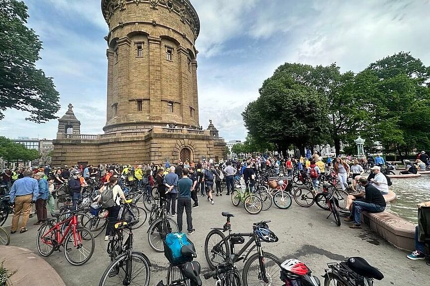 Am Sonntag, 7. Mai 2023 starteten im Rahmen einer Sternfahrt des ADFC rund 750 Menschen auf dem Fahrrad vom Mannheimer Wasserturm zur Bezirkssportanlage Käfertal-Süd.